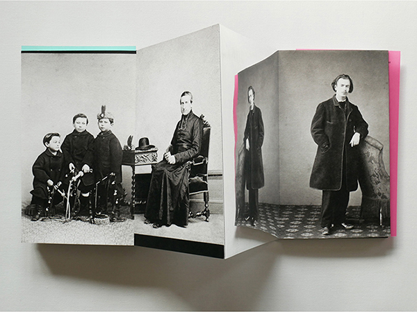 This Leporello gathers 87 Cartes de visite that follow one another on the principle of a visual exquisite corpse. Made popular by Disderi in 1854, the 'Carte de visite' portraits gained rapid commercial success within the Bourgeoisie and soon became a means of social recognition. Wherever the portraits come from, this genre is characterized by recurrent types of poses and the use of identical props: chair, table, column, curtain, wood paneling, painted landscape...