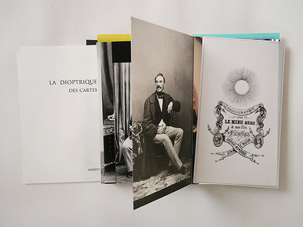 104 pages, 87 photographs printed on Kozo paper, 13 mirors, 4 inserted flyers (tracing paper) : text excerpts from Descartes' Dioptric (yellow) and Disderi's writings (magenta), list of photographers (cyan) and ex-libris (white)