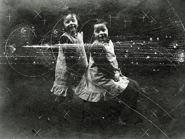Once again, the nature of the photographic image is at play in this series where photographs of female twins have been blurred by the traces of trajectories formed by the collisions of elementary particles.