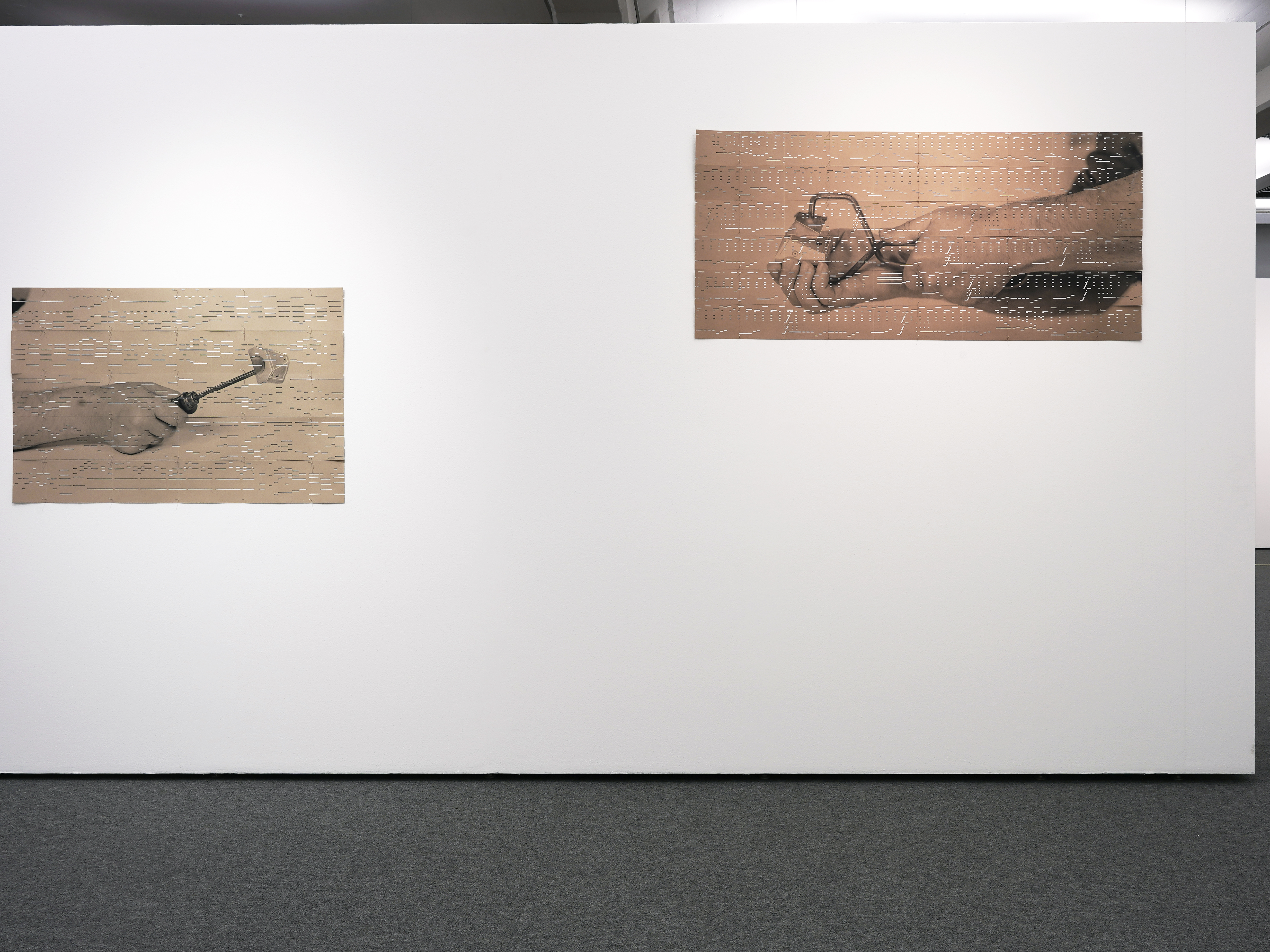 Men's hands brandish tools whose shape evokes hammers, pincers and pentaprisms. These artifacts seem to have become so obsolete that no one today can say with any certainty what they were once used for. The images documenting them were printed on music cards for mechanical organs. These archaic media, whose operating principle is similar to that of Pianola rolls, are the ancestors of MIDI files and the cousins of the punched cards and tapes used in the early days of computing. Here, they suggest the repetitive, throbbing rhythm of mechanical music, but also the impossibility of deciphering the sound or identifying the representations they support.Men's hands brandish tools whose shape evokes hammers, pincers and pentaprisms. These artifacts seem to have become so obsolete that no one today can say with any certainty what they were once used for. The images documenting them were printed on music cards for mechanical organs. These archaic media, whose operating principle is similar to that of Pianola rolls, are the ancestors of MIDI files and the cousins of the punched cards and tapes used in the early days of computing. Here, they suggest the repetitive, throbbing rhythm of mechanical music, but also the impossibility of deciphering the sound or identifying the representations they support.
