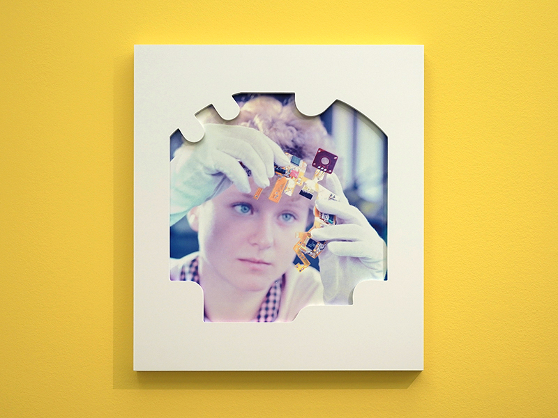This image, borrowed from the Pentacon archive (TSD Museum, Dresden), shows a female worker gazing with a somewhat melancholic expression at a flexible circuit fitted with a chip - in the manner of someone looking at a slide - as if inspecting it. It's probably an advertising photograph, but her gesture doesn't actually make any sense. The print is presented in a white frame, the window of which matches the counterpart of a lens board platine, a photographic object from another time. Its immaculate whiteness is reminiscent of the clean rooms in which all microelectronic components would later be manufactured.