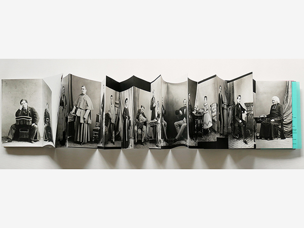 This Leporello gathers 87 Cartes de visite that follow one another on the principle of a visual exquisite corpse. Made popular by Disderi in 1854, the 'Carte de visite' portraits gained rapid commercial success within the Bourgeoisie and soon became a means of social recognition. Wherever the portraits come from, this genre is characterized by recurrent types of poses and the use of identical props: chair, table, column, curtain, wood paneling, painted landscape...