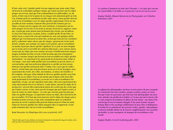 104 pages, 87 photographs printed on Kozo paper, 13 mirors, 4 inserted flyers (tracing paper) : text excerpts from Descartes' Dioptric (yellow) and Disderi's writings (magenta), list of photographers (cyan) and ex-libris (white)
